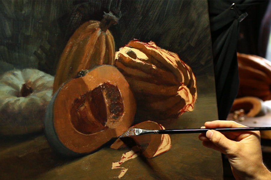 We’ve been working up to our most complicated still life yet; in this demonstration, I want to show you how one subject can tell a story and have so much visual interest. Here in this painting, we discuss the techniques covered in the previous demonstrations but at a larger scale. I am constantly balancing visual elements to create interest. I want to show you the dynamic combinations of light against dark, of soft versus sharp and of muted against saturated. This demonstration will have you coming back again and again – SO MANY TECHNIQUES!